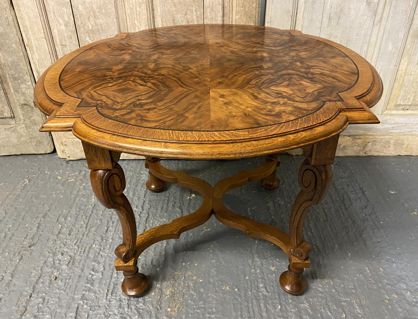 This is a delightful burr walnut coffee table, made in the 1920s in Carolean style. The top is nicely shaped with black line inlay. The shapely base is strong and sturdy.