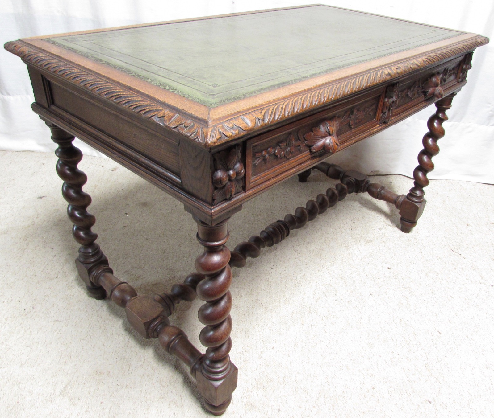 This is a nice free standing oak table, lovely carved decoration and having 2 drawers to the front which run smoothly. All the carving is crisp and very well carved. The leather to the top have been replaced by ourselves. The table is strong and sturdy and would suite a variety of uses such as in a hall, a desk or in the lounge. Dating to the Late Victorian period.
