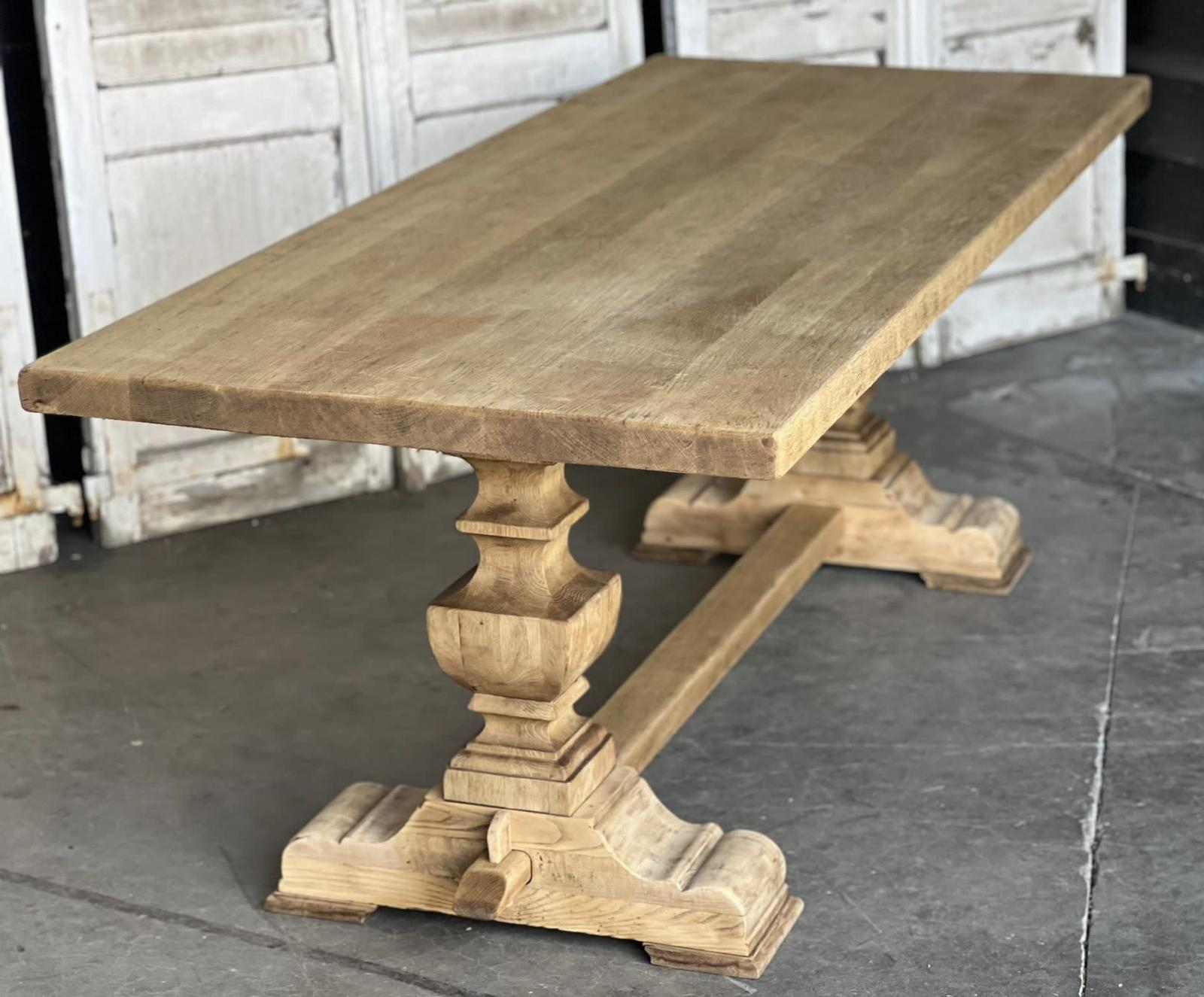 This is a really nice model of a solid oak farmhouse refectory dining table. French in origin dating to the early 1900s and of very good quality construction this table will be around for generations to come. It comes completely apart for easy access into the home. We have bleached it for a lighter look and to bring out the beauty of the wood, in overall excellent original condition for the home and a bit deeper than most.