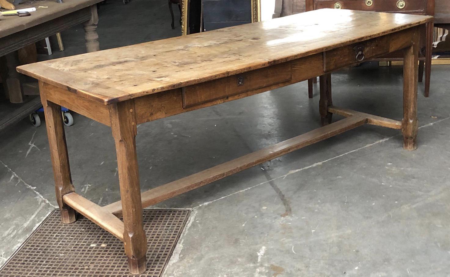A super early French dining Table made from Chestnut and oozing character, wonderful patina from years of use and nice colour. Having 2 drawers to one side and 60.5 cm knee clearance which is good, this would be a lovely rustic farmhouse kitchen table in excellent original condition for the home.