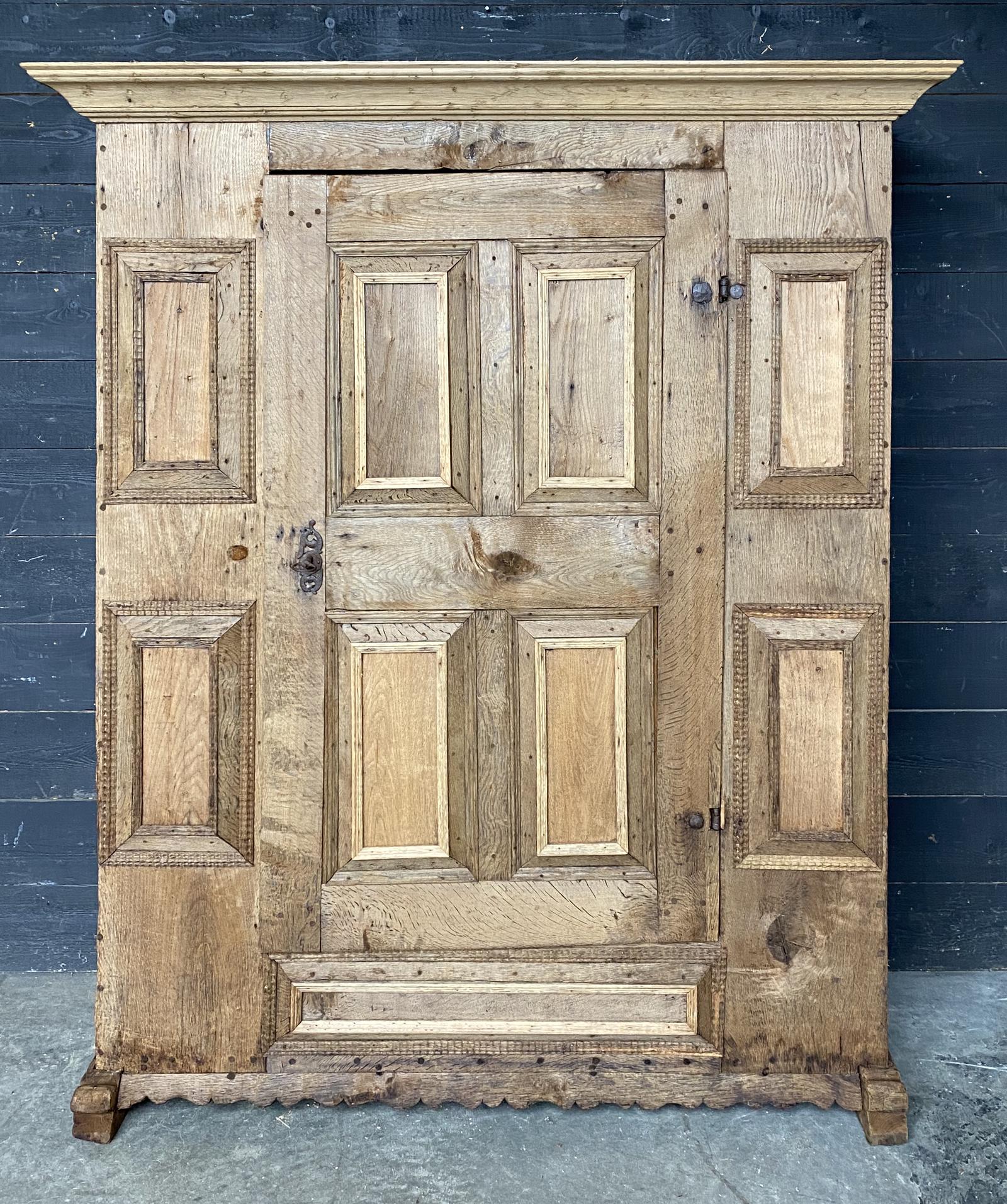 A very early late 17th / early 18th Century Wardrobe or Cupboard. Made from Oak, very rustic with great iron lock and hinges (original key present). Inside it is shelved out but these can be removed if hanging is preferred. It would also make a great larder cupboard in a Farmhouse style kitchen.