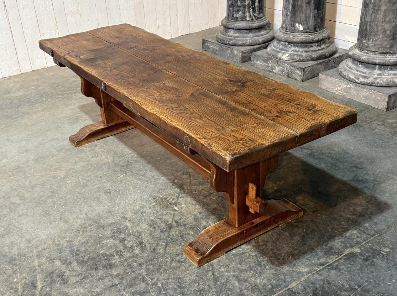 We are pleased to offer this wonderful Farmhouse Dining Table. Solid Oak and a thick 2 plank Top, also retaining its warm original colour and patina. French in origin from the Loire and of excellent quality construction this table will be around for generations to come. The top comes off for easy access into the home and in overall excellent original condition. Would seat 12 people.