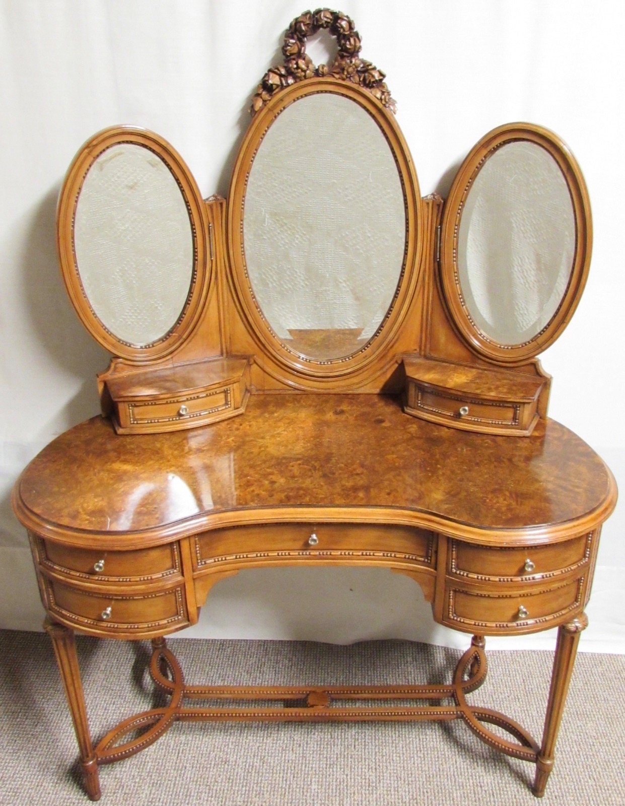 We are delighted to offer this Dressing Table, it is perhaps the best Burr Walnut dressing Table we have seen. French in origin and having superb style. It is kidney in shape and made from solid Walnut with fine Burr Walnut veneers to the tops. The 3 bevelled glass oval mirrors all move independently, the central mirror is crested with a crisp and deeply carved garland, carved out of 1 piece of walnut. The 7 drawers all run smoothly and fitted with original brass handles. The legs are elegant and slender united by a stretcher. The decoration continues around the sides and even the back is the same quality. The drawers are made from Solid Oak internally with excellent dovetails showing the high quality craftsmanship which has constructed this piece.
