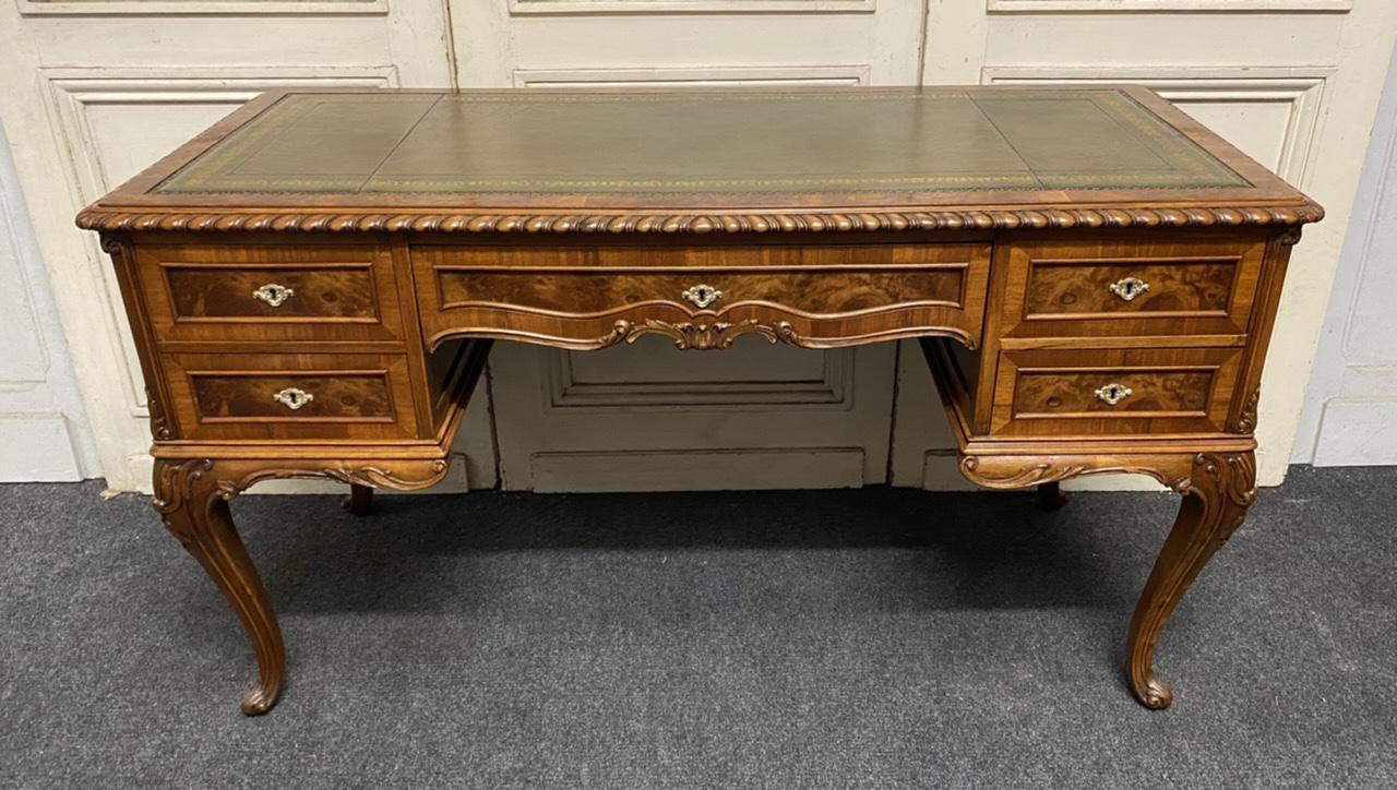 A very good Quality Leather Top Desk, originating in France in the mid 19th Century. The desk can be free standing in a room as finished on all sides. The 5 drawers all run smoothly. Key present and all locks work. Nice crisp carved decoration and she sits on cabriole legs. The quality of this piece is very high which can be seen in the construction, lovely dovetail joints, excellent tight Burr Walnut.