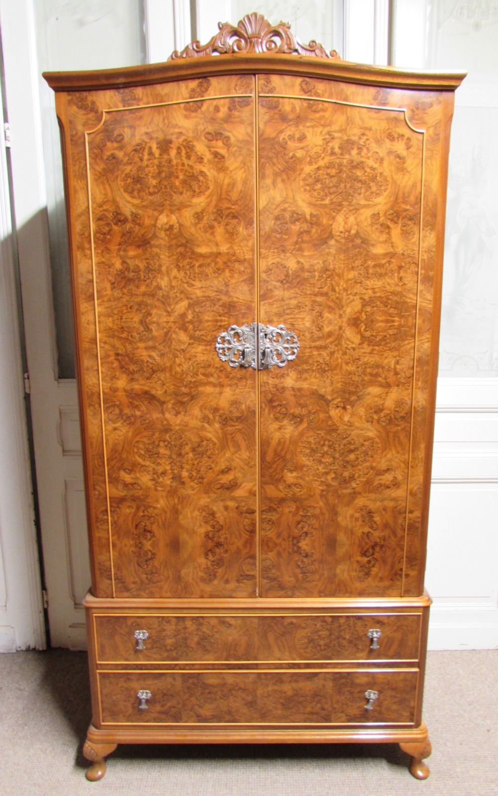 A superb 2 door Wardrobe made from Walnut with wonderful Burr Walnut to the front. Having 2 door that open to reveal a hanging space to the left and 4 glass fronted drop down compartments to the right. Underneath are 2 larger drawers. The handle plate is stunning and original as are the handles to the drawers, she sits on Queen Anne legs.