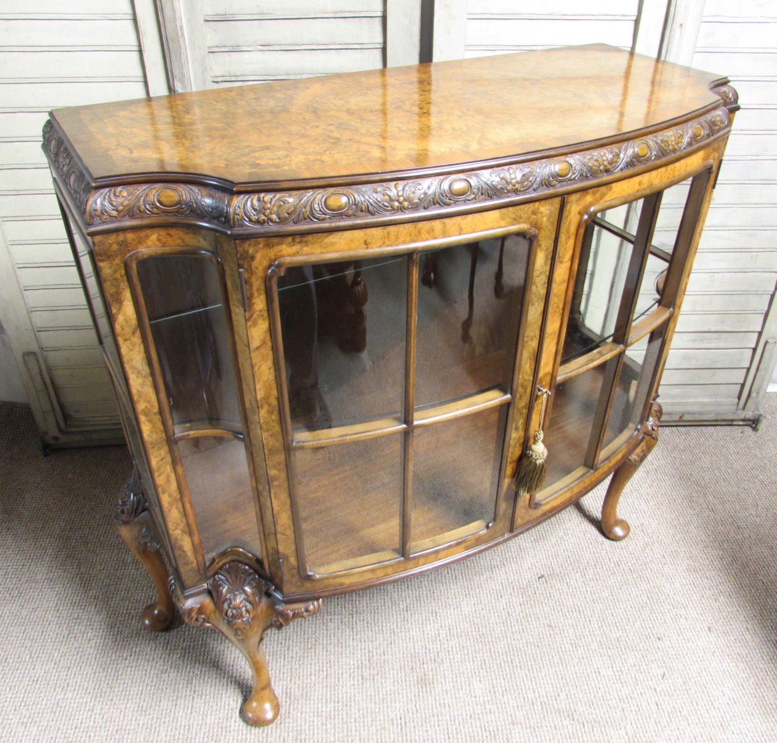 A delightful Queen Anne display or china cabinet, made from walnut with the best burr walnut, a wonderful shape being bowed at the front with concave corners. The knees having superb crisp carving from Solid Walnut and she sits on Queen Anne legs. The 2 lockable (key present) doors open to reveal a single glass shelf. A point of quality is the astragals inside the doors. The top is cross banded in walnut and has another finely carved freeze around. The cabinet has a lovely warm colour.