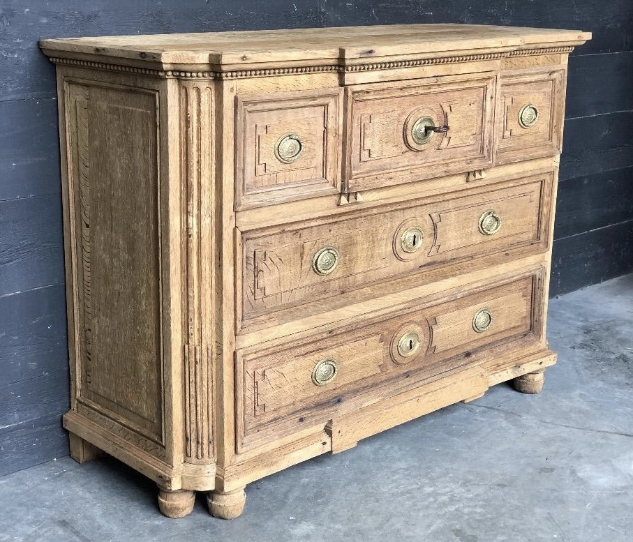 This is a superb and very old oak chest of drawers or commode. Totally original and key present. Lovely details such as the canted corners. All the drawers run well.