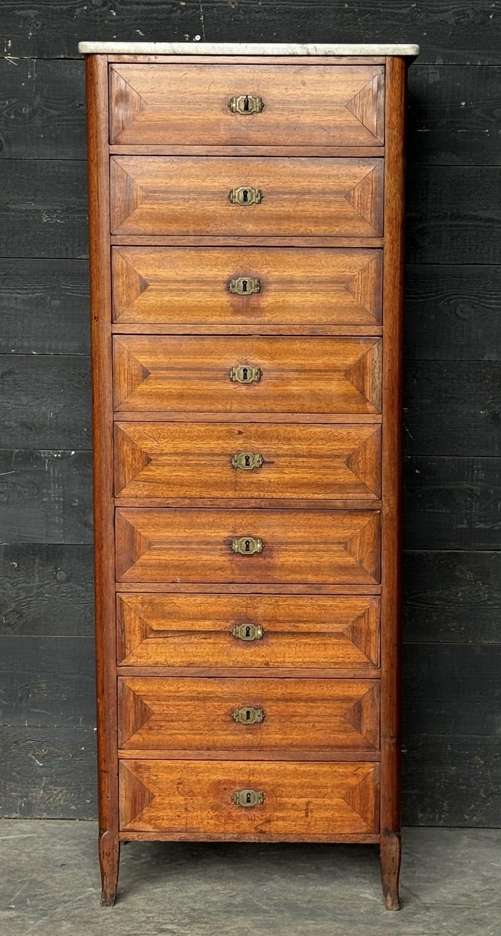 A lovely French Tall Chest of Drawers with marble top. Dating to the 18th Century and made from Walnut. The 9 drawers all run smoothly. Condition is pretty good but being 18th Century has a few age related blemishes. A rare piece of early French furniture.