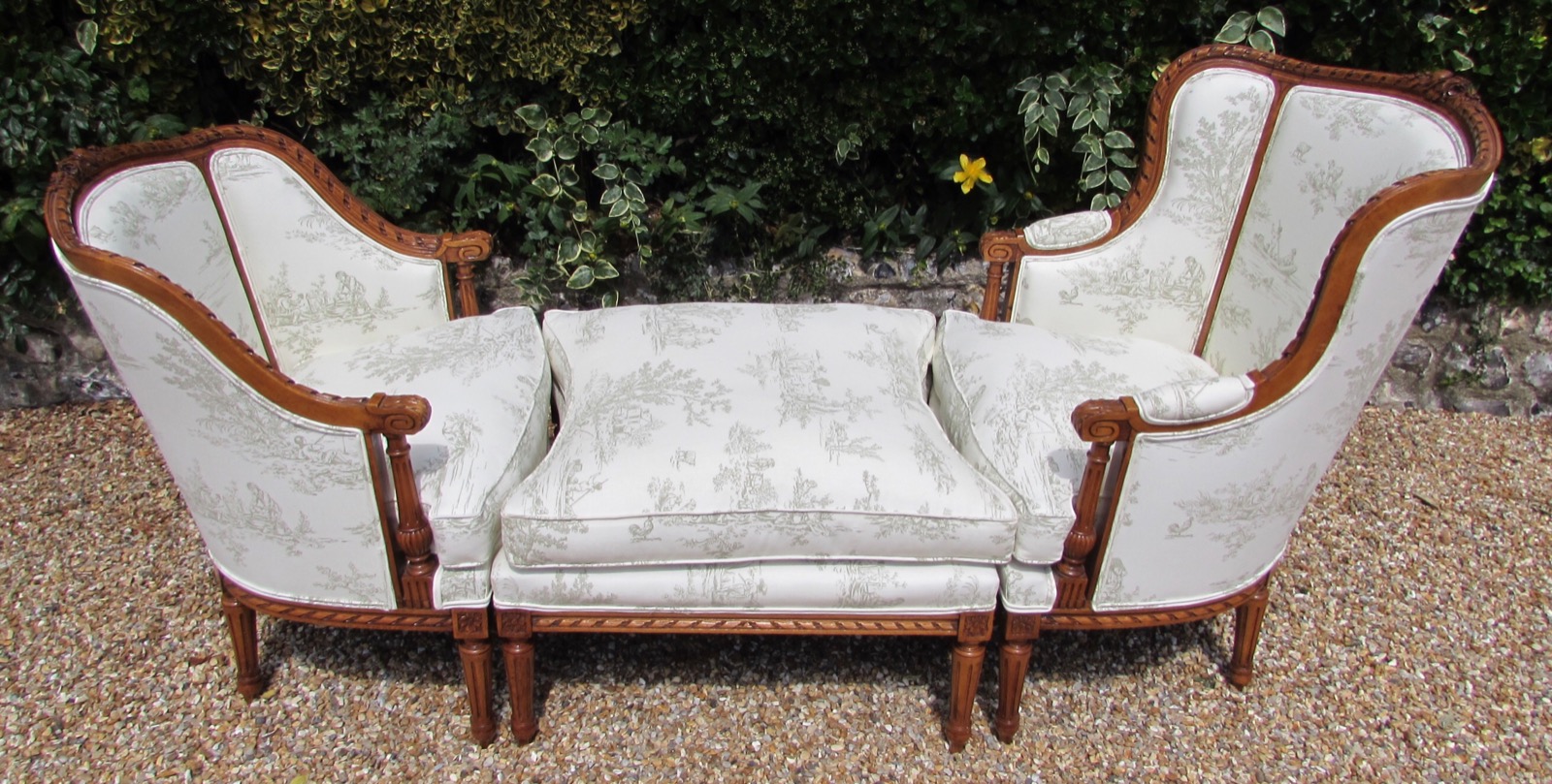 We have had new upholstery fitted in a high quality French toile fabric. The internal padding and horse hair is very good and comfortable. The frames have been re finished to a high standard.