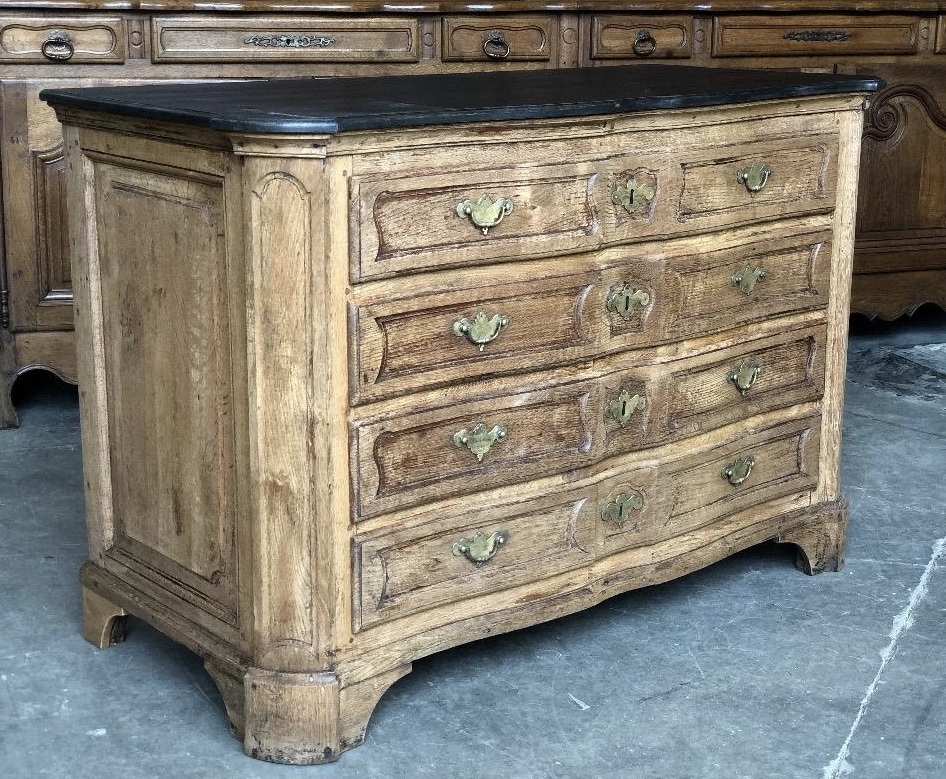 A wonderful early French Serpentine Louis XIV Commode Chest of Drawers, dating to the 18th Century and made from Solid Oak with pegged construction, the from is serpentine in form and nice panelled sides. All the drawers run smoothly. We have bleached the chest with a black top for a fresh look.