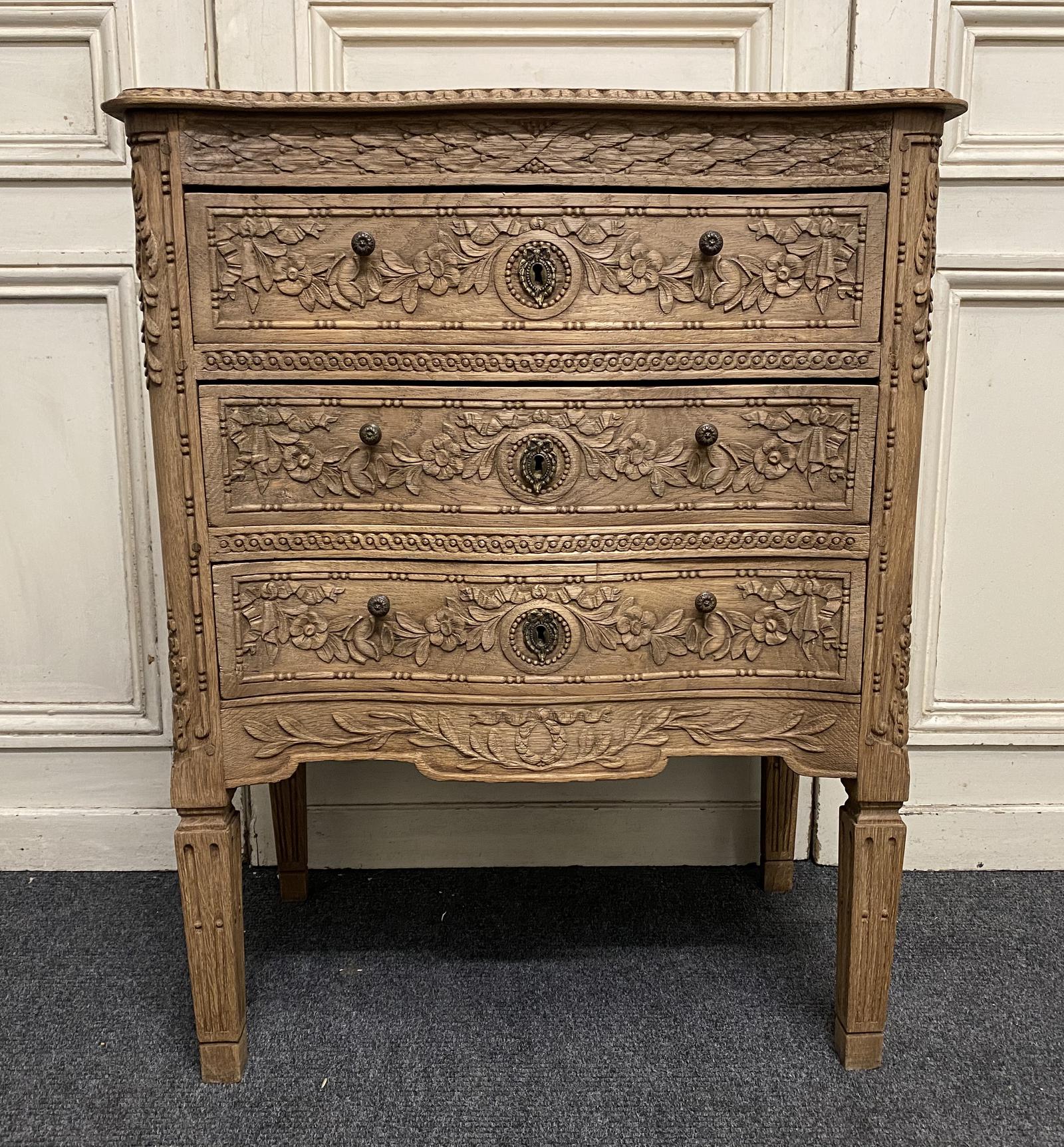 A very pretty smaller sized French Chest of Drawers, having serpentine front and 3 smoothly running drawers. Nice carved decoration all over.