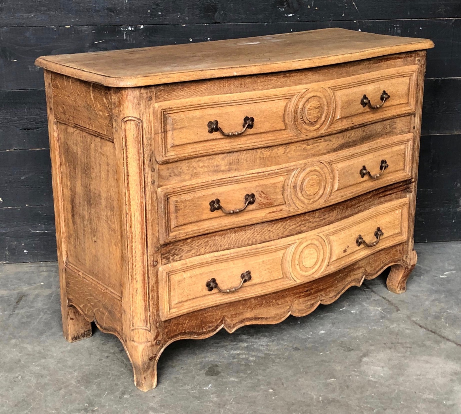 A lovely French Oak Chest of Drawers, Serpentine in form to the front, all the drawers run smoothly and fitted with original handles. She has been bleached for the modern look but can of course be waxed to any shade desired.