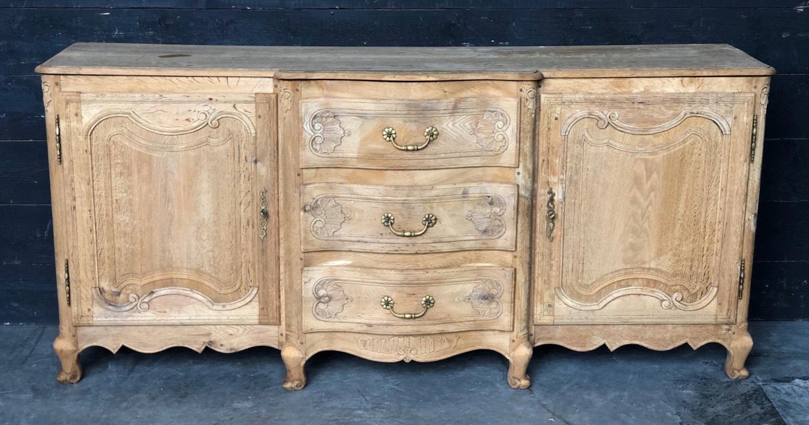 A wonderful French dresser base or buffet, made from solid oak and having plenty of storage. Lovely serpentine in form and having carved decoration. All the drawers run smoothly and fitted with original handles.