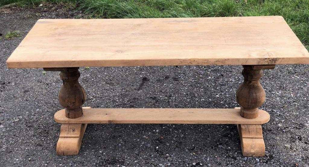 A lovely solid Oak Farmhouse Dining Table. A bit smaller than the usual ideal for a kitchen but still able to comfortably seat 8 people. We have bleached this for a fresh look but it can be waxed to any colour or shade.