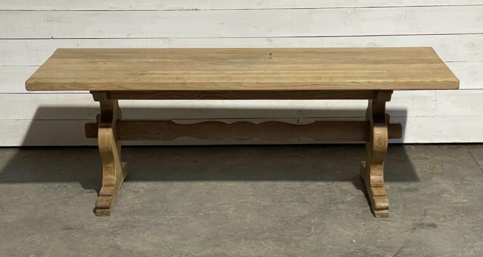 Lovely trestle end farmhouse refectory dining table, made in France in the early 1900s from solid oak. It is of good quality construction this table will be around for generations to come. We have bleached it to lighten it and bring out the natural wood.