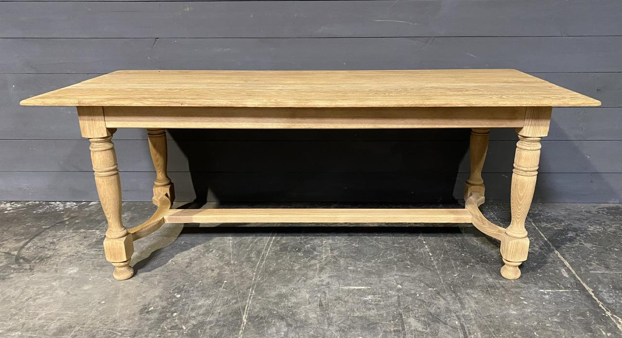 This is a lovely design French farmhouse solid oak dining table. Excellent quality construction and dating to the early 1900s. We have bleached it for a lighter look and in overall excellent original condition.