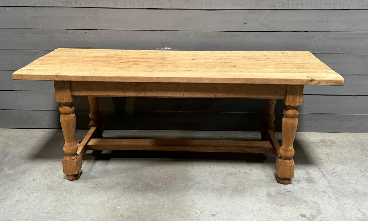 This is a lovely French solid oak farmhouse dining table. We have bleached this for a lighter look and to bring out the natural beauty of the wood. The top comes off for easy access into the home and in overall excellent original condition.