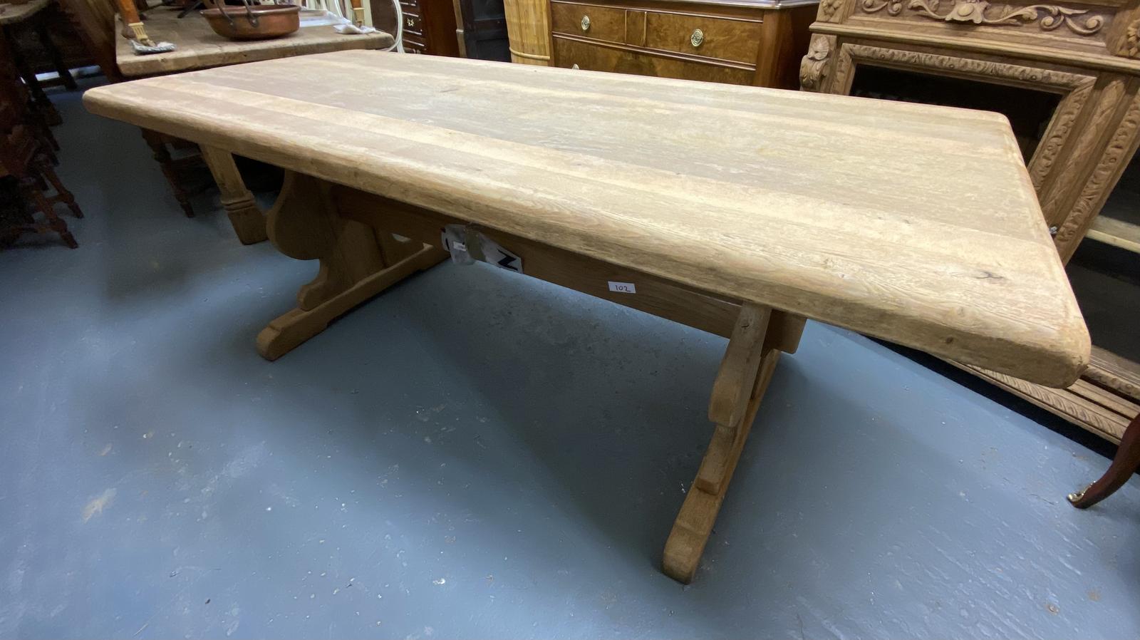 This is a nice oak farmhouse refectory dining table, made in France in the 1920s. We have bleached this table for a lighter look. The top comes off for easy access into the home.