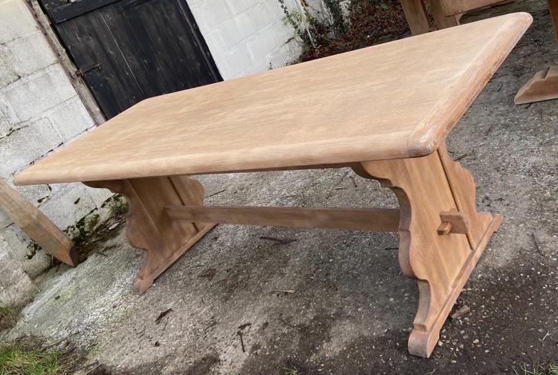 A well constructed Oak French Farmhouse Refectory Trestle End Dining Table. Made in the early 1900’s from Oak which we have bleached for a Lighter look. The top comes off and the base knocks apart into 3 pieces for easy access i to the home.