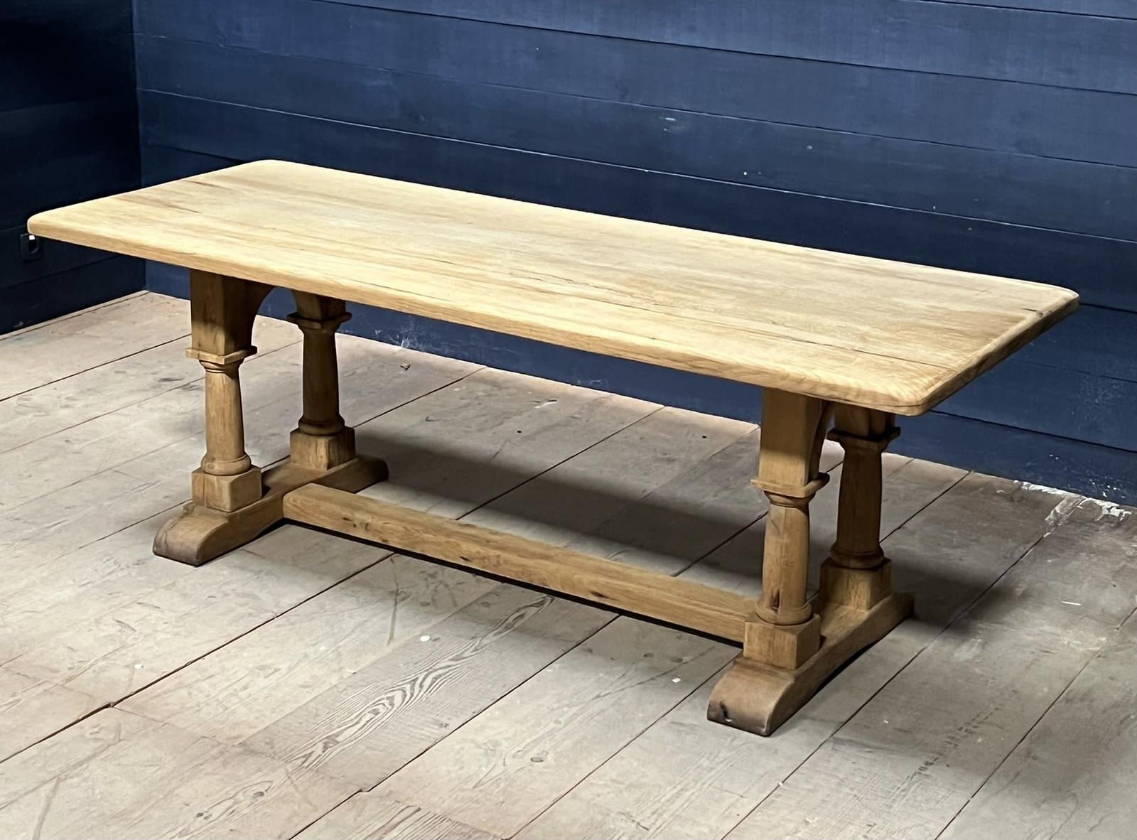 This is a nice French bleached oak refectory farmhouse dining table having a nice base. Made from solid oak and dating to the early 1900s and of excellent construction this table will be around for generations to come.