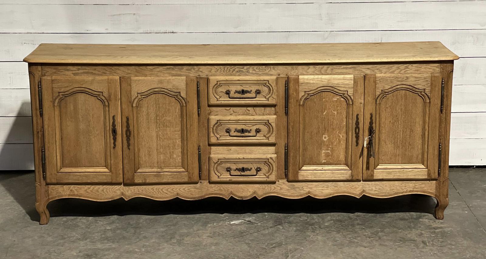 A lovely example of a French Enfilade or as we would call it a Sideboard or Dresser Base. Made from solid Oak around the turn of the 19th/20th Centuries. Of very good quality construction, we have bleached the Oak to bring out the natural wood and a fresh look.