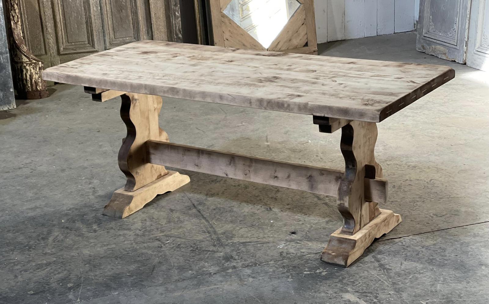 A lovely French trestle end farmhouse refectory kitchen dining table, not too large at 180cm. Made from oak in the early 1900s, of good quality construction. We have bleached it to bring out the natural wood.