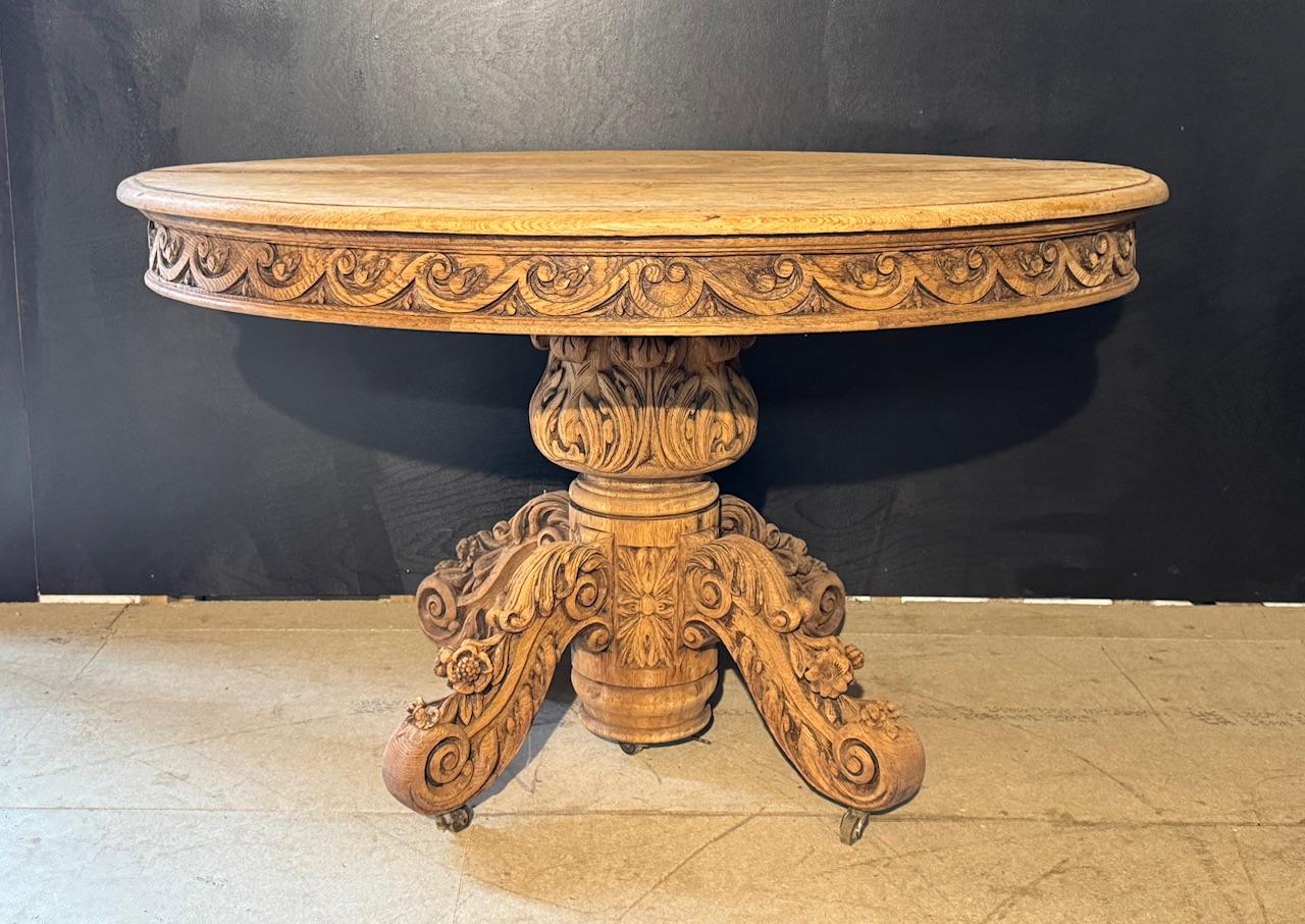 These tables are becoming hard to find, dating to the mid 19th Century and made of oak. Profusely carved and highly decorative an ideal centre or hall table. These tables were traditionally used after a hunt to toast their success. They can be extended and have runners underneath and the top splits, they used to place boards across the runners.