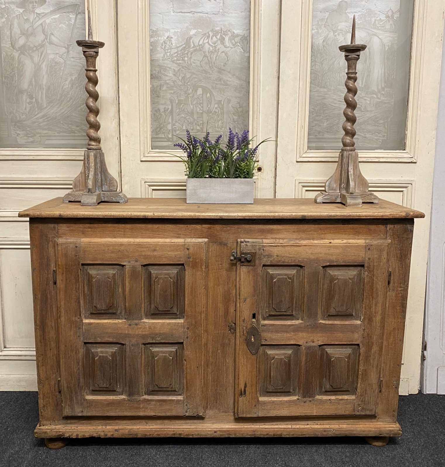 A lovely French farmhouse oak cupboard, sideboard or dresser, hard to date but certainly 18th Century. Made from solid oak and very heavy, the back is a delight made from 2 planks. The 2 doors have lovely original hang forged catches and open to reveal a single shelf. We have bleached this charming piece for a fresh look but can be waxed to any colour or shade desired.