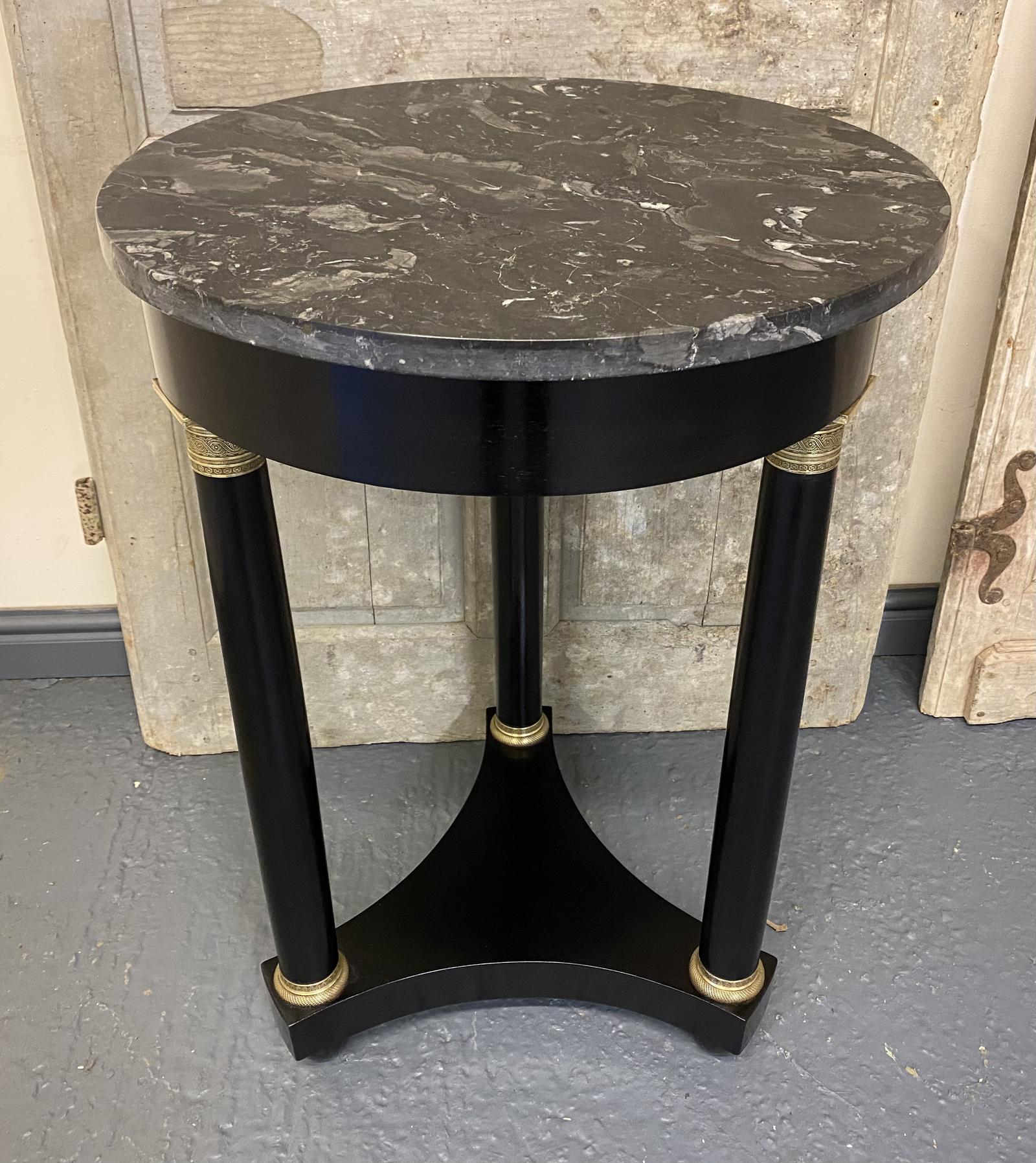 This is a lovely French Empire lamp or cocktail table. The main table is ebonised and has excellent quality brass caps and bases to each column. The original marble top is in prefect condition.