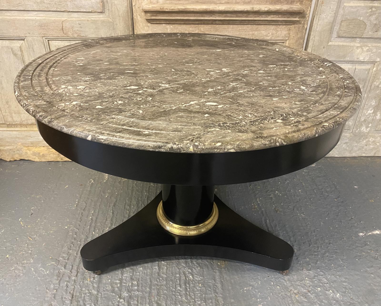 This is a very stylish French marble top gueridon centre table dating to the mid 19th Century and having its original grey marble top which has decorative concentric grooves towards the edge.