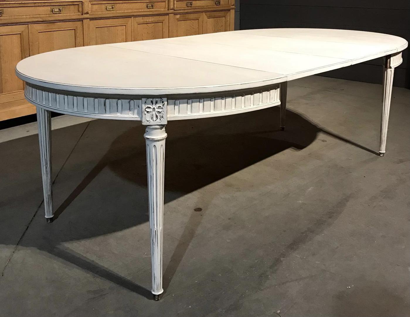 A lovely French painted extending dinning table, having 2 leaves which can be added either 1 or 2. Nice quality table, brass capped feet and fluted legs.