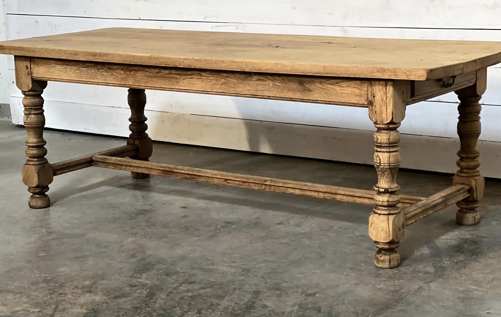 This is a great looking French antique farmhouse kitchen dining table with drawer in one end. Made from solid oak around 1900 and of excellent quality construction. We have bleached this to bring out the natural wood.