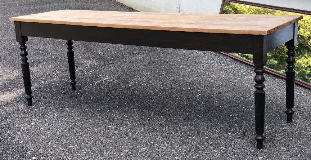 A nice Kitchen Table dating to the mid 19th Century. Having a pine plank top and the base has been painted black at some point in the past but now very mellow in appearance. All the joints are pegged and the table is strong and sturdy.