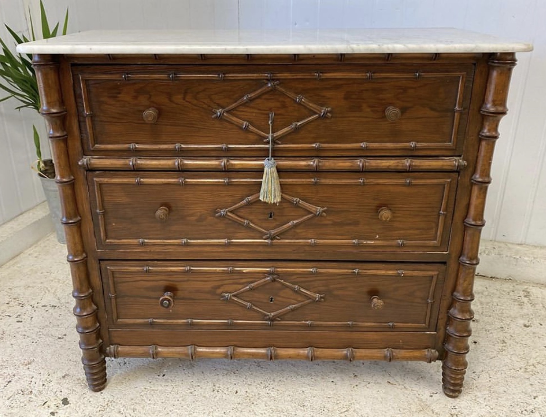 A lovely and highly decorative faux bamboo chest of drawers, made in France from pine in the late 19th Century. The original marble top is in perfect condition. All the drawers run smoothly, fitted with original handles and key is present.