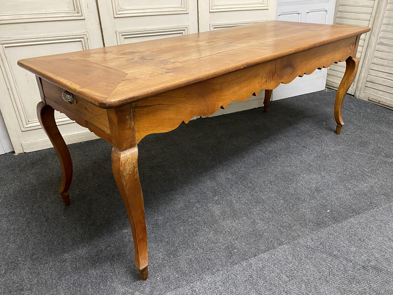 A delightful French Farmhouse Dining Table, dating to the early 19th Century and made from Fruitwood. It has the most wonderful original colour and patina, a drawer at one end and a bread slide at the other. Knee clearance is fine at 61 cm