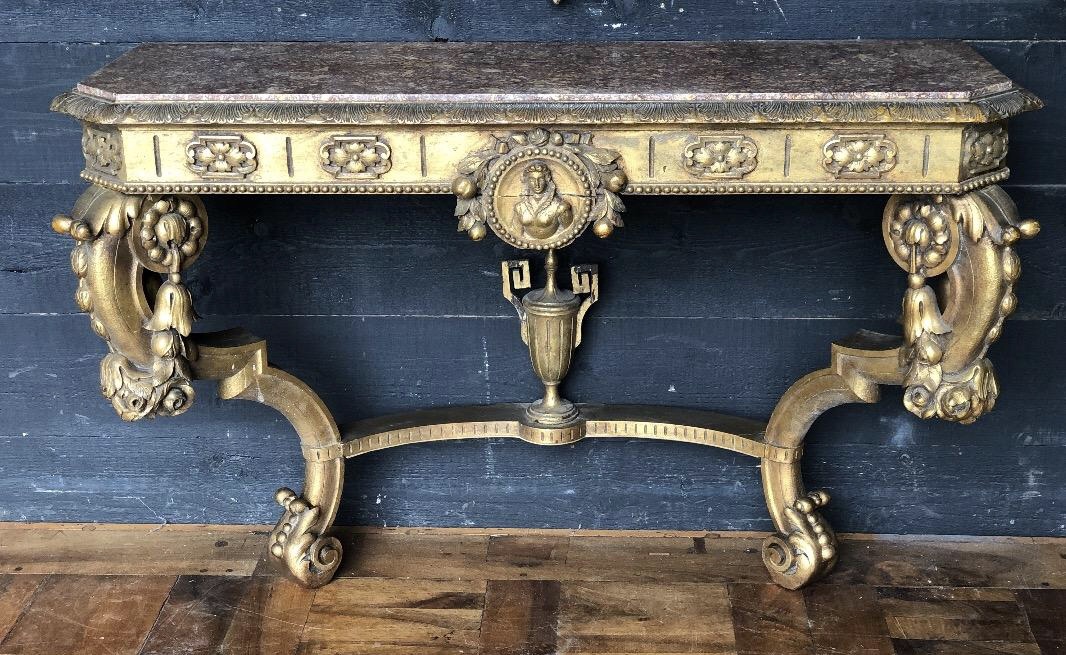 A superb quality French Louis XV Console Table. Carved wood then Gesso and gilded. Lovely red/white original and perfect marble top. This table is highly decorative and of the best quality from the late Victorian period.