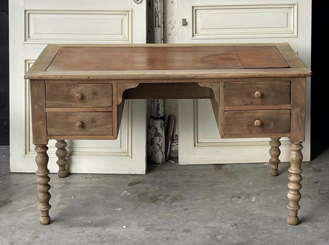 A great French desk with lots of character, made from solid Walnut which we have bleached and dating to the late 19th Century. All the drawers run smoothly and fitted with original leather, this has water marks as can be seen but if preferred we can easily replace with a new leather of your colour choice.