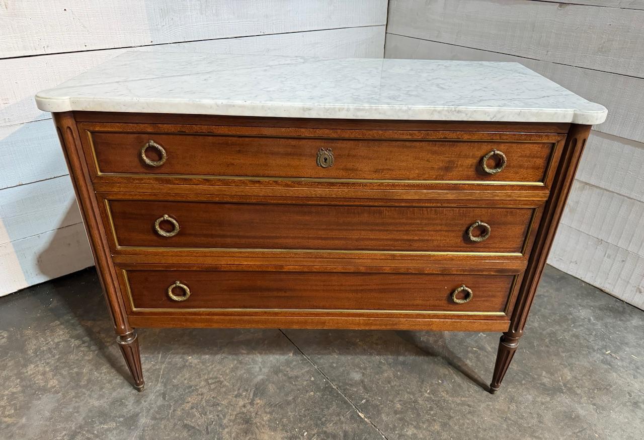 This is a pretty French marble top Louis XVI style commode chest of drawers made from walnut with original prefect white marble top. Brass detailing around the drawers and brass capped feet. All 3 drawers run smoothly fitted with original handles.