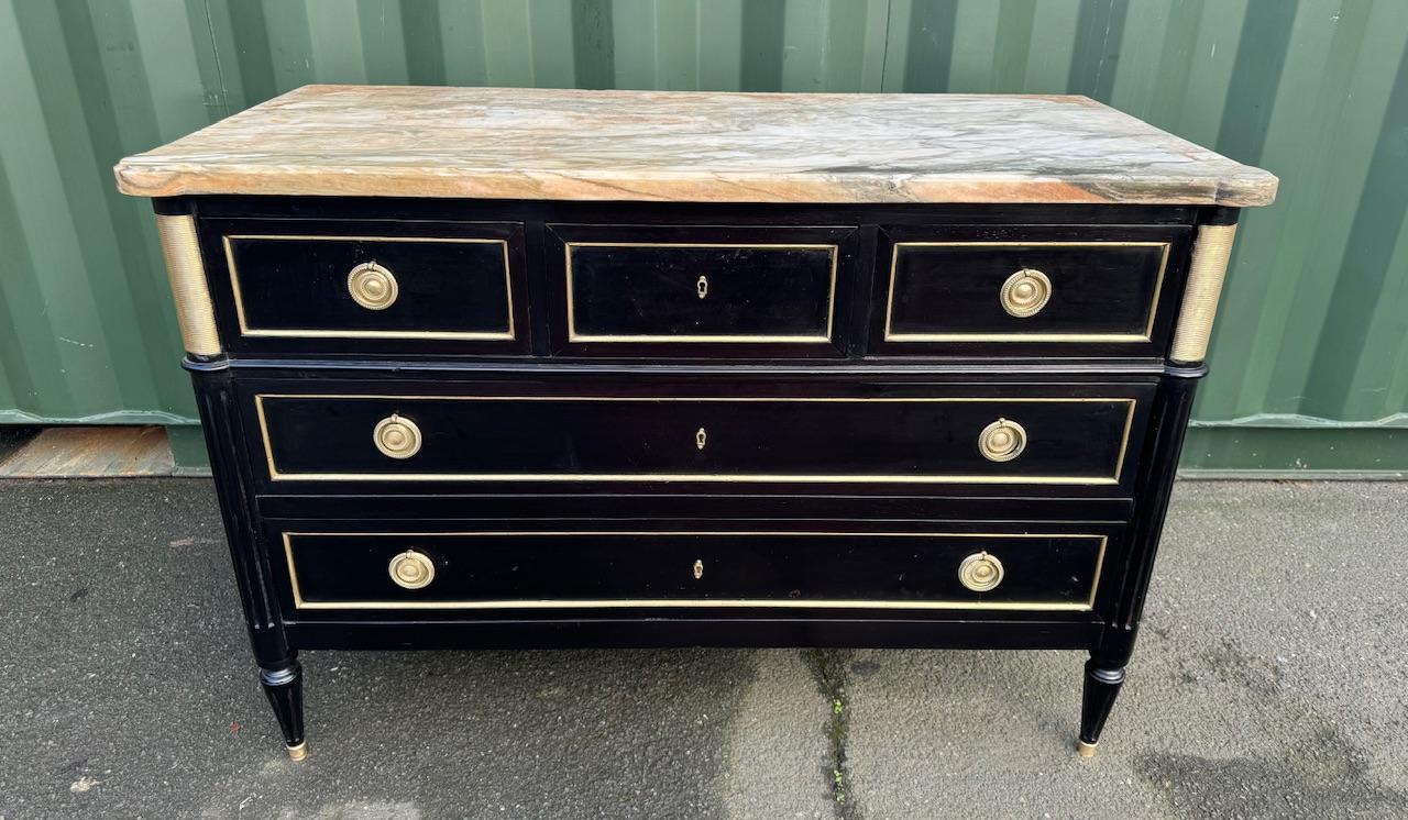 This is a lovely French 'Louis XVI style' antique commode chest of drawers that have 5 smoothly running drawers, original brass handles and mounts and original marble top which is perfect. We have re finished this to a high standard so in excellent original condition for the home.
