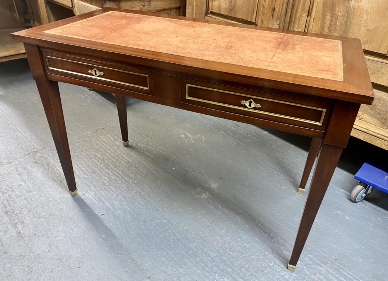 This is a lovely 'Louis Xvi style' French writing table or desk, made from mahogany and having brass insets and brass capped feet. It has 2 side slides that each slide out 22cm. The 2 front drawers slide smoothly and there is a key to open the drawers but the locks do not work. It has its original leather and we have fully re French polished it to a high standard.