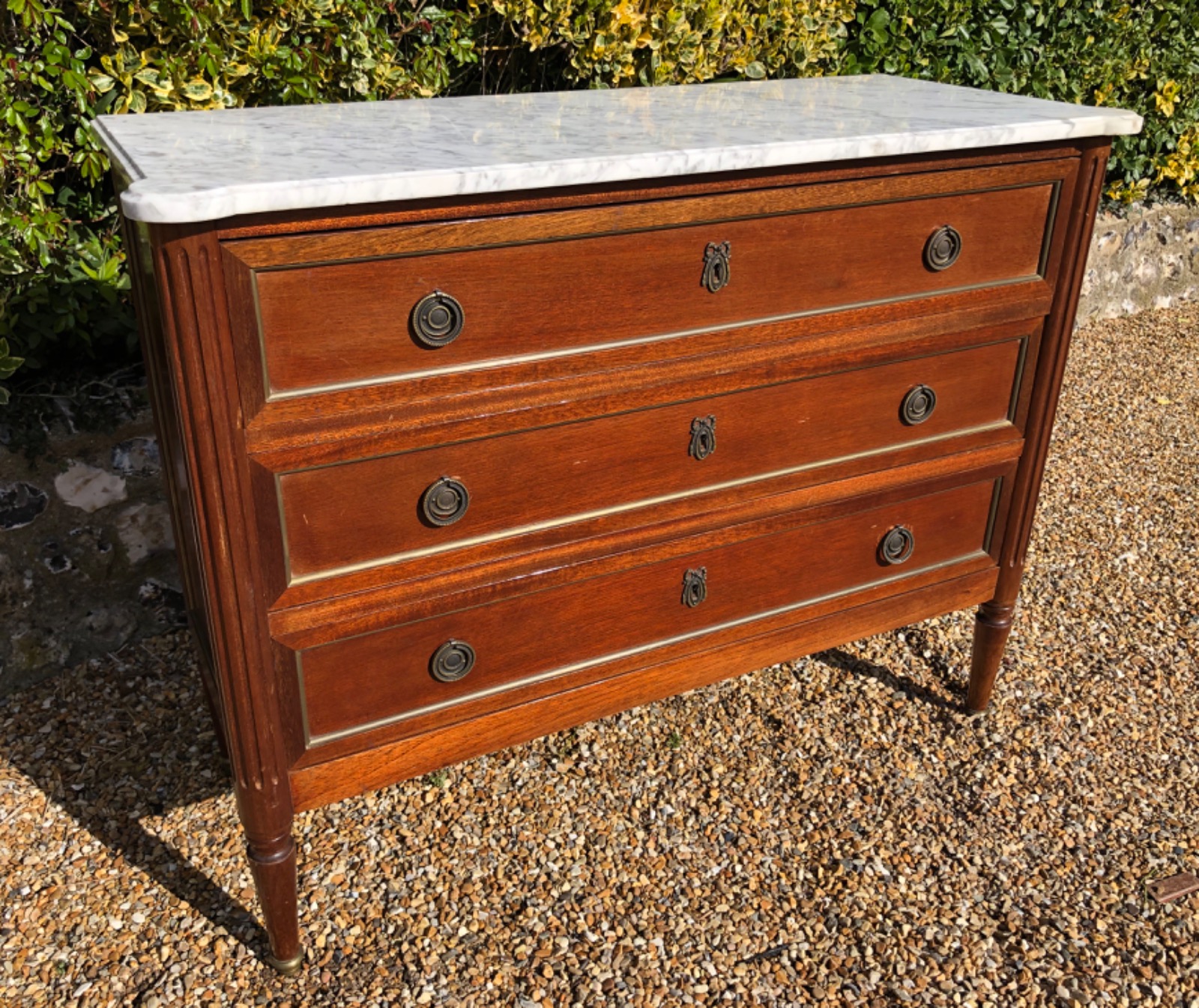 A stylish French Chest of Drawers made from Mahogany and having a white marble top. There is brass line decoration and she sits on brass capped feet. The drawers all run smoothly and fitted with original brass handles. This is a good quality piece as can be seen from the dovetails and the solid Oak Drawer linings.