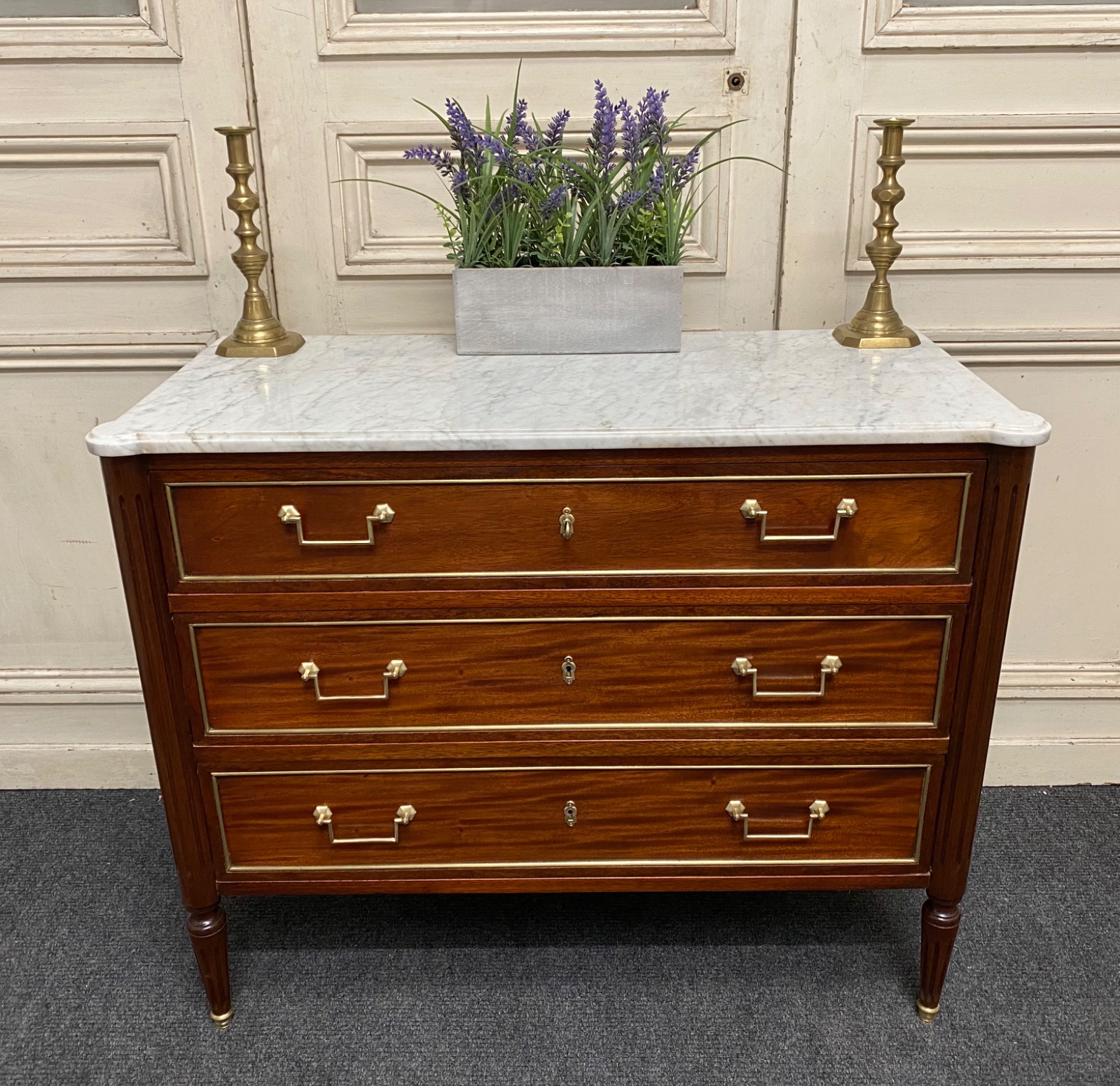 A superb French commode chest of drawers, made from mahogany and having original perfect white marble top. All the drawers run smoothly fitted with original brass handles. Lovely brass detailing around the drawers and around the end panels, brass capped feet. This very pretty chest is in excellent condition for the home having been fully refinished to a very high standard.