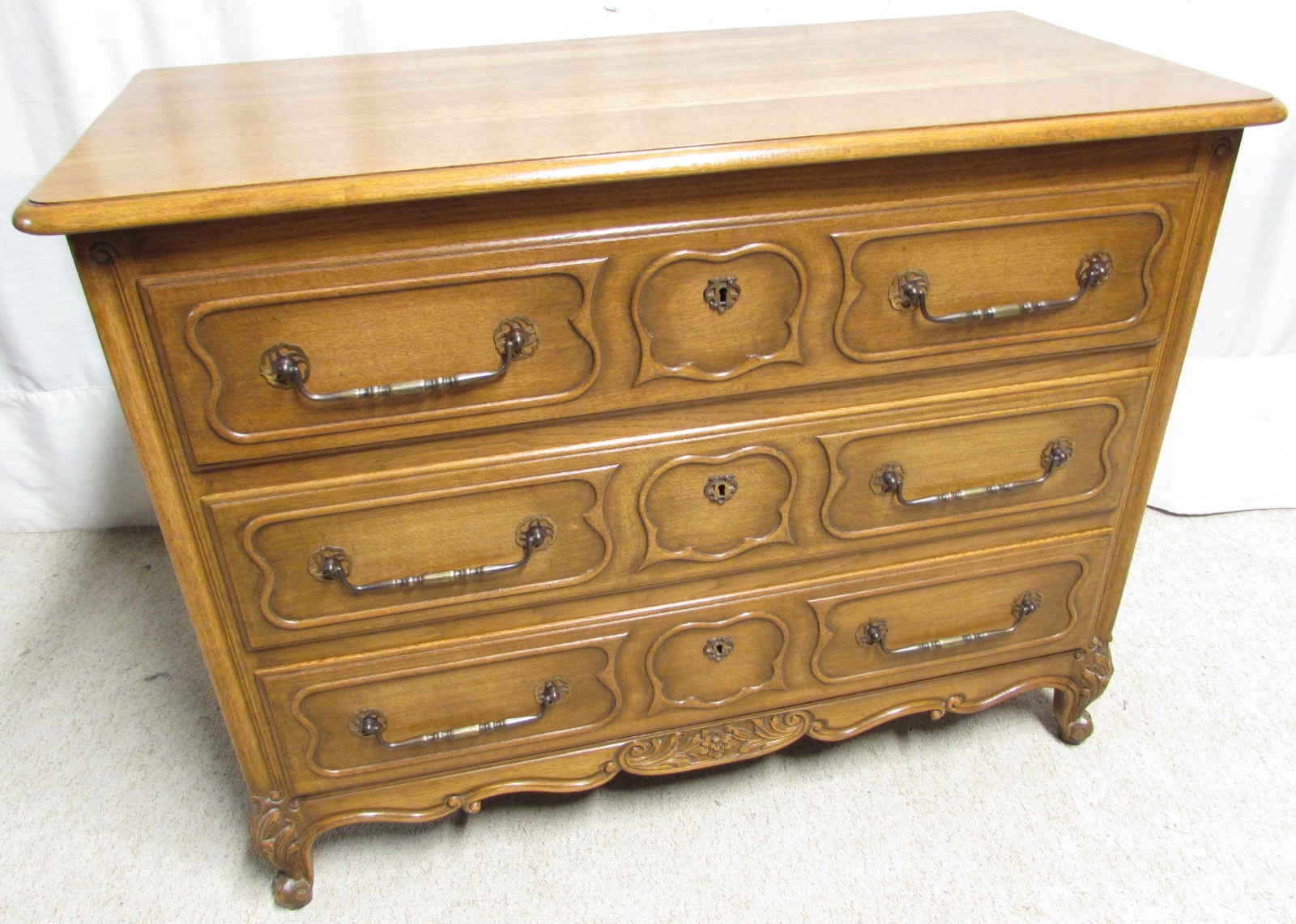This is a stylish French commode chest of drawers, made from solid oak. All the drawers run smoothly and fitted with brass handles all locks work (key present). Nice crisp carved detailing.