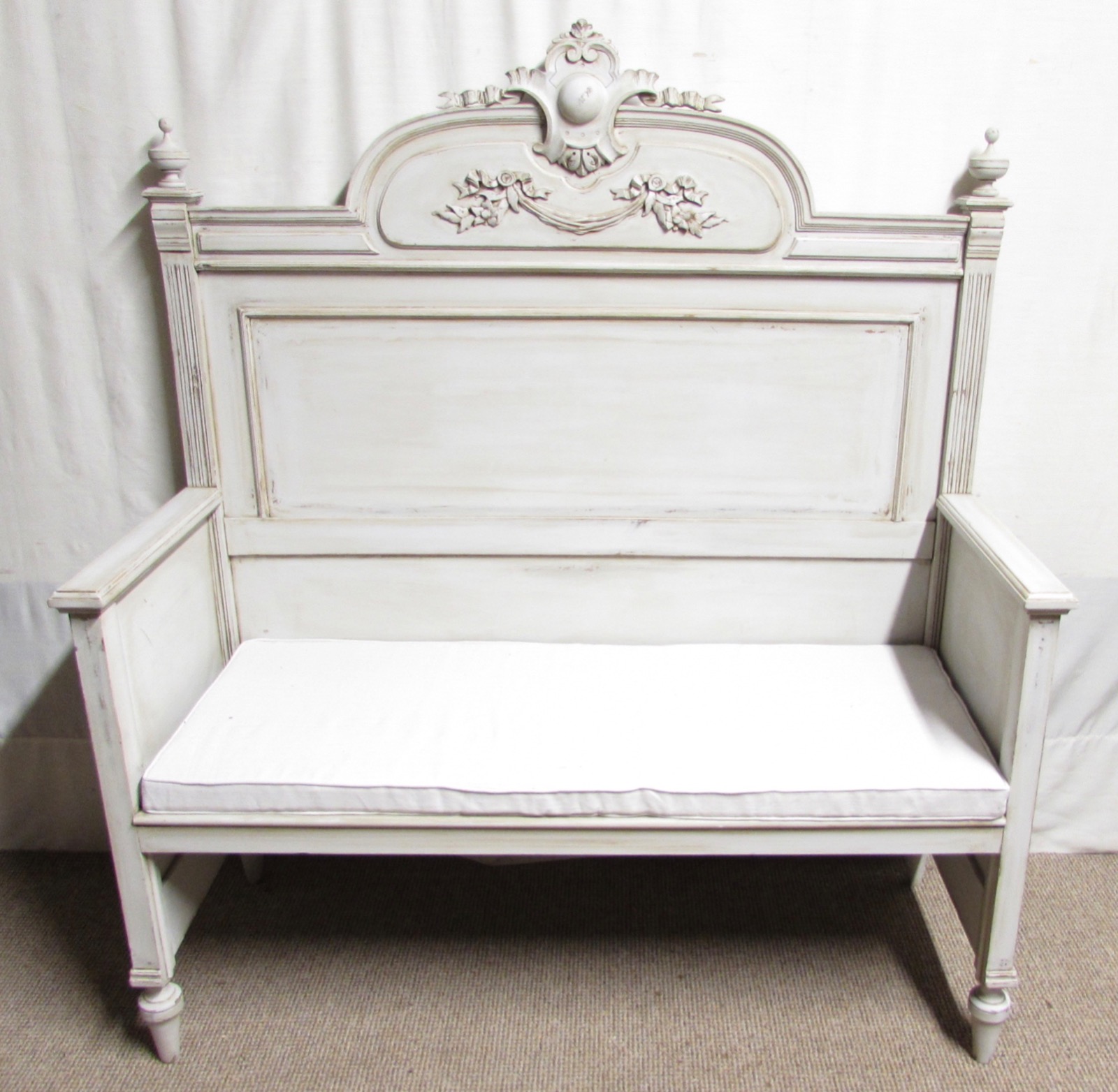 This is a delightful French antique Hall Bench, original paint. Highly decorative and useful in excellent condition for the home. Cushion squb included in excellent condition.