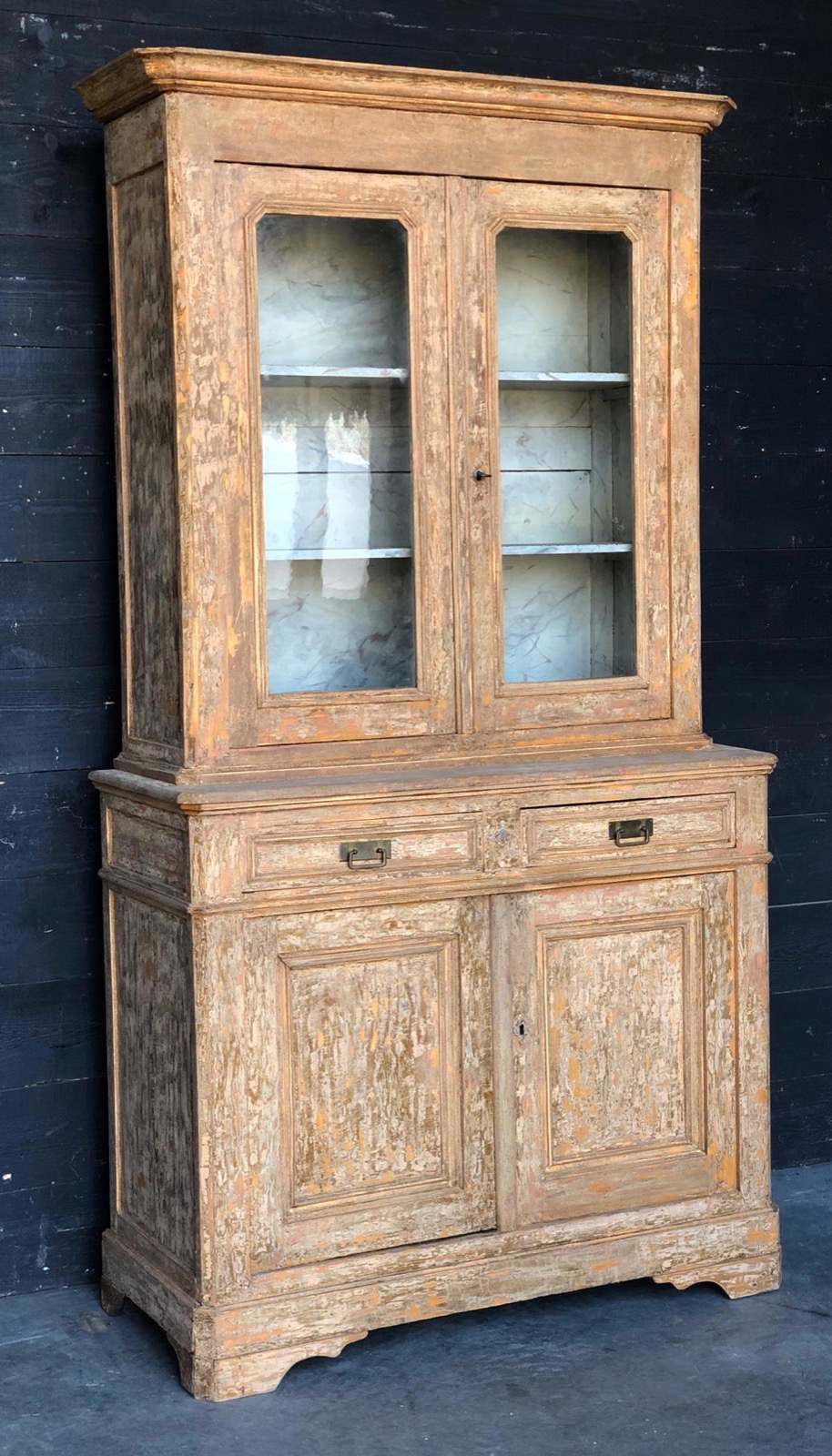 An early French Deux Corps or Bookcase. Made from pine and having its original paint which has been scraped. The interior of the top has a paint marble effect which is unusual. This is an early piece dating to around 1830 and having hand blown bubble glass.