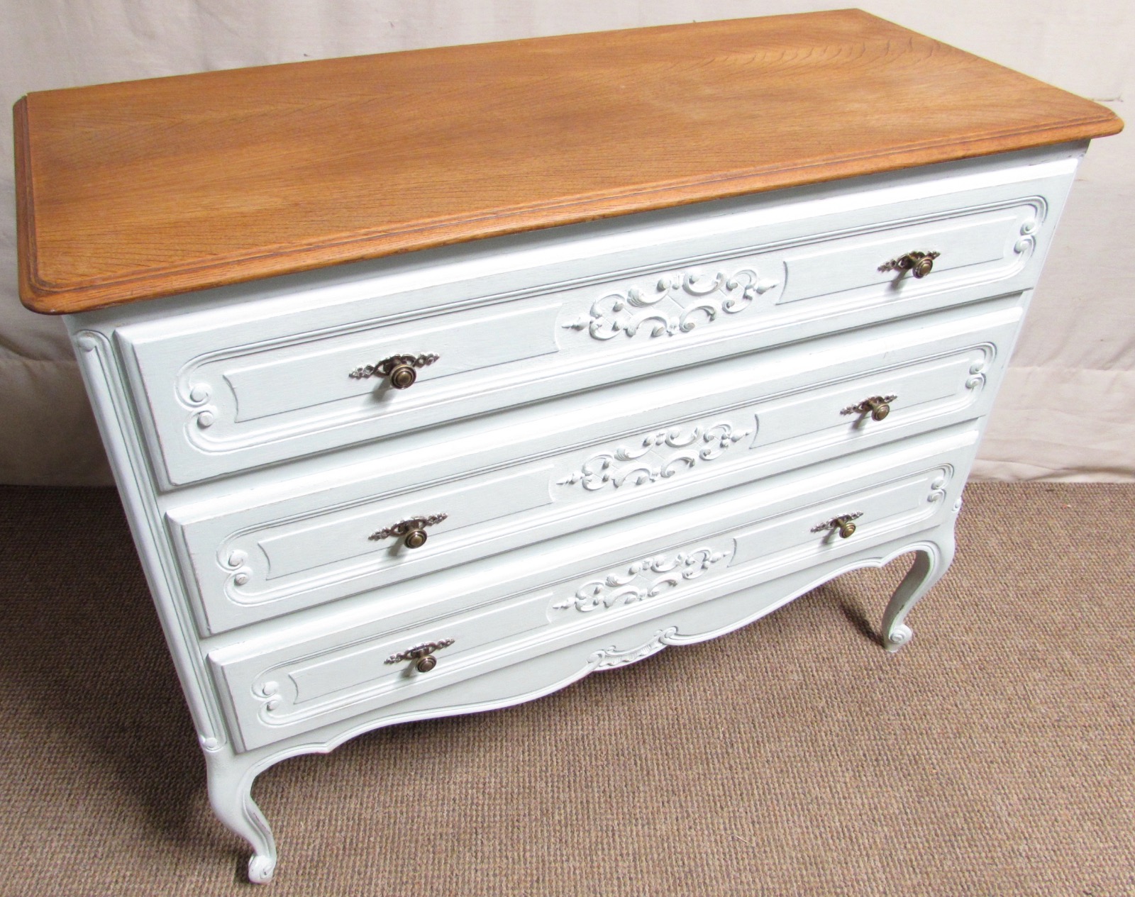 A delightful French Chest of Drawers dating to the 1900's, having 3 drawers all fitted with original Brass handles and sitting on cabriole legs.