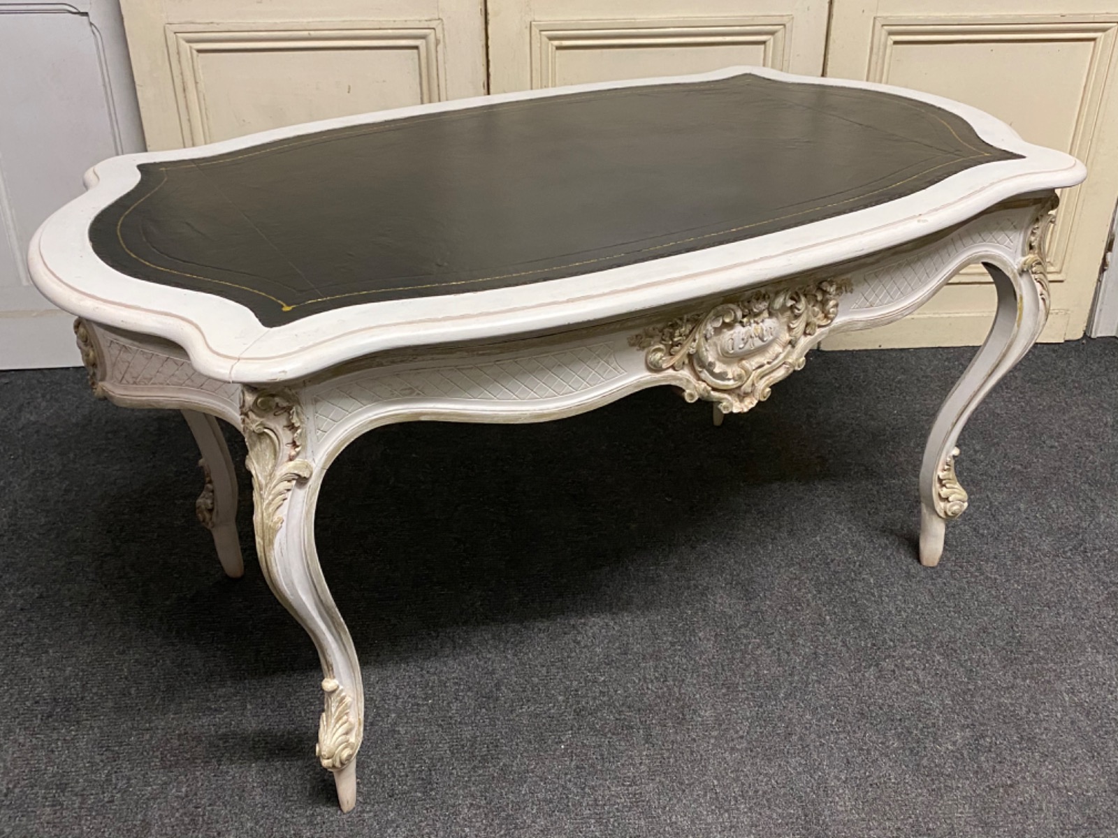 A superb French Centre Table, rococo in style with 4 serpentine sides, she sits on ornate cabriole legs with beautifully carved decoration having gilded highlights. This table dates to the mid 19th Century. We have replaced the leather top with a black sumptuous leather.