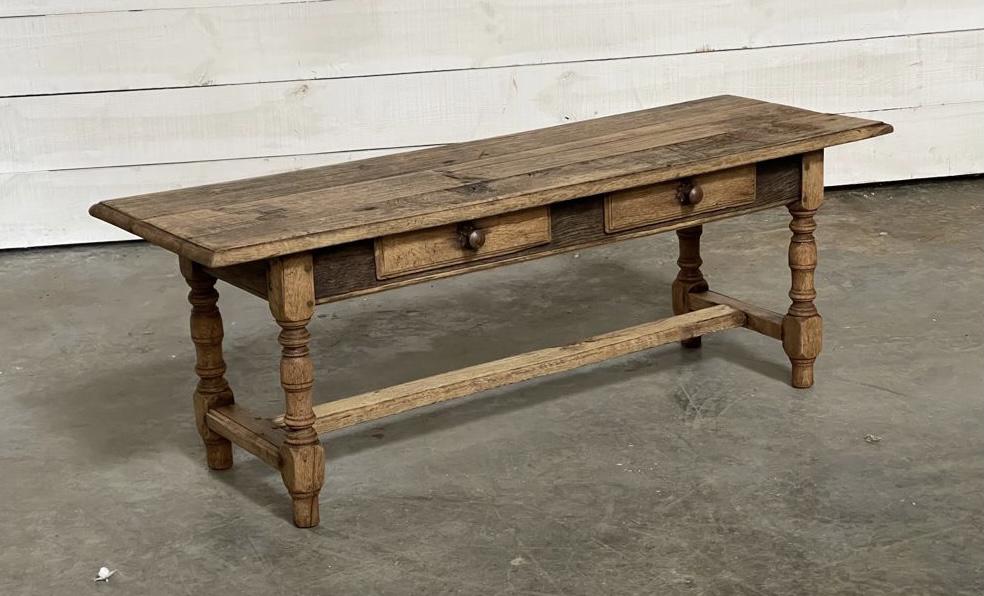 A lovely French oak rustic coffee table with 2 small drawers to one side. We have bleached this to bring out the natural wood.