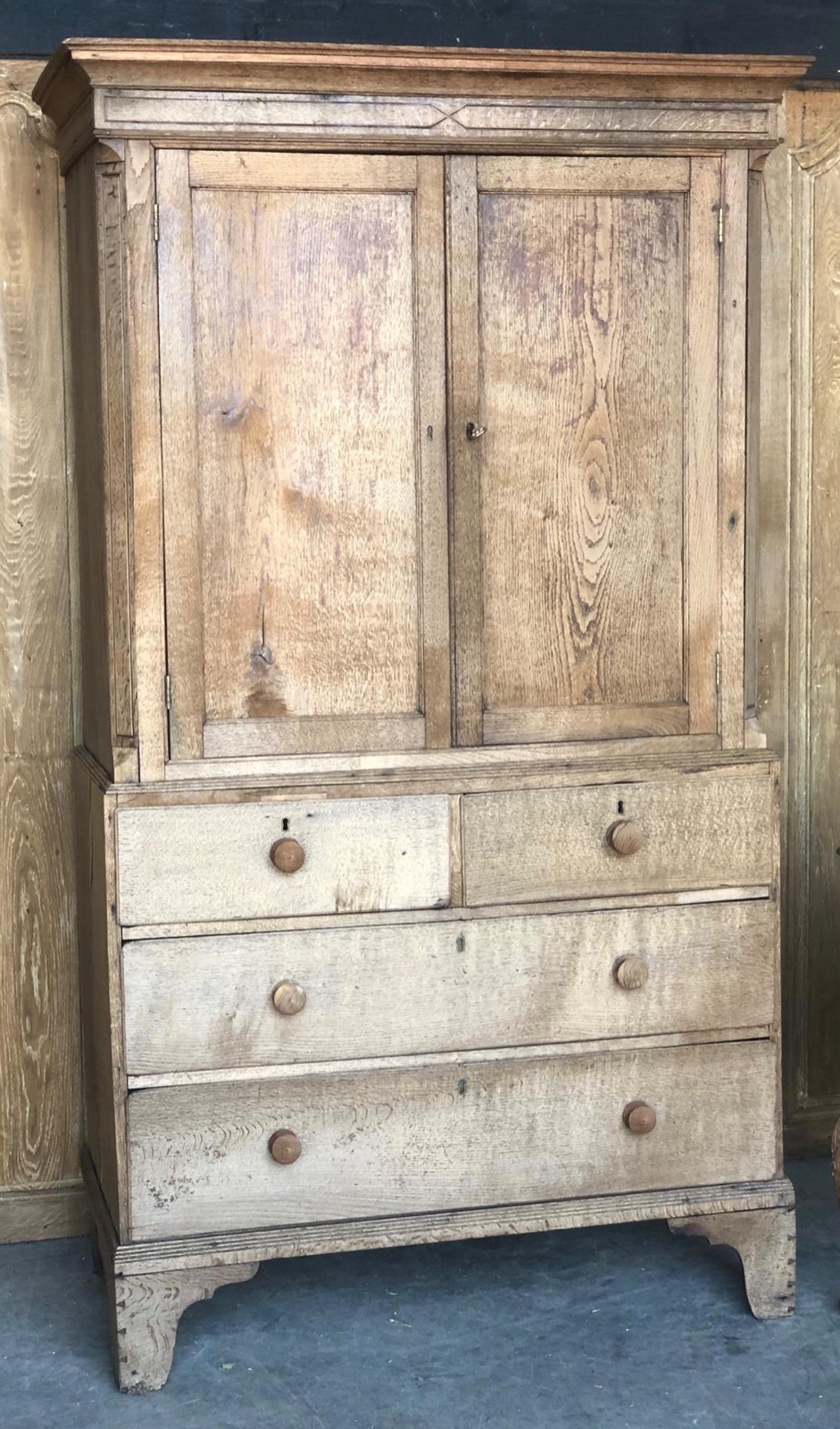 A wonderful Welsh farmhouse country oak linen-press. Made around 1800 and having 4 drawers under and above the 2 doors open to reveal 2 shelves, nice canted corners and sitting on bracket feet. Would also make a good larder kitchen cupboard. We have bleached this for a fresh look but it can be waxed to any shade or colour desired.