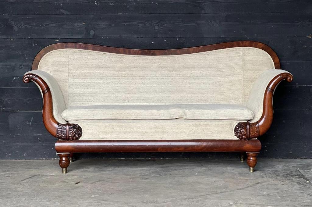 Excellent quality French mahogany Empire Regence period settee, sofa or couch. The mahogany is high quality cuban mahogany having a lovely original patina and colour. Nice end carved detailing and brass cups to the feet. The upholstery is in very good usable condition but of course you may wish to re upholster in your own fabric. This cane from a nice Parisian apartment.